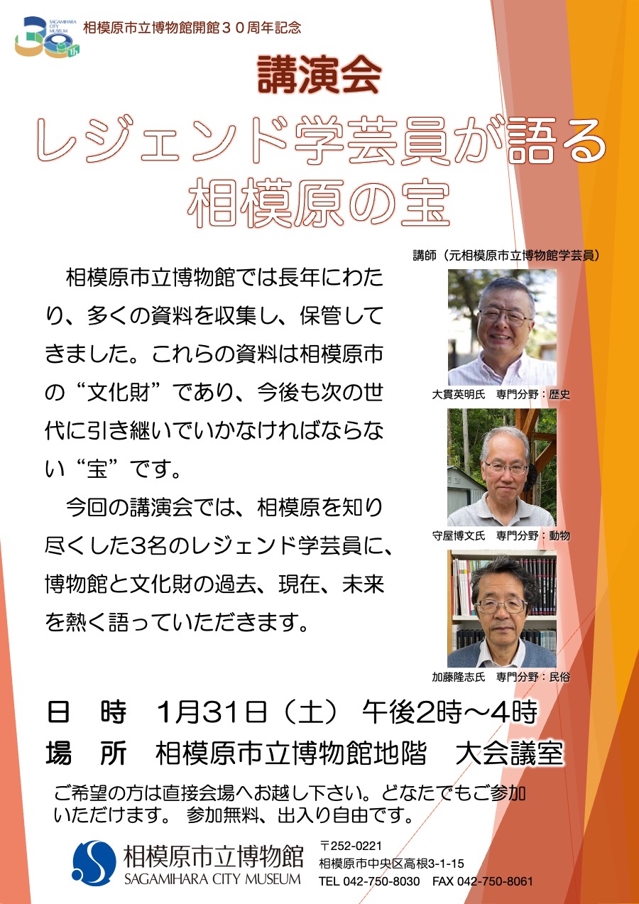 講 師(元相模原市立博物館学芸員):大貫英明氏(歴史)、守屋博文氏(動物)、加藤隆志氏(民俗)