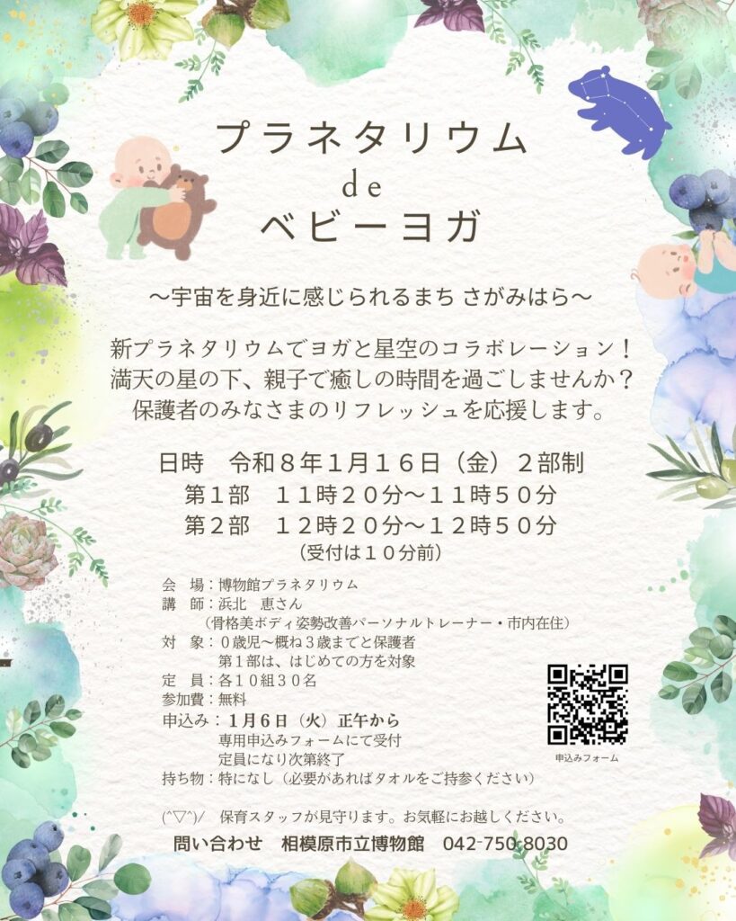 整体もできるインストラクターの浜北恵さんを講師に迎え、プラネタリウムドームの中でその日の星空とともに楽しめる親子ヨガです。夜空のなかで泣いちゃってもお互いさま!季節の星座絵動物たちがみなさんを待っています。どんな動物に出会えるかは、乞うご期待!子育て中のみなさまのリフレッシュを応援します。また、昨年から地下の授乳室に調乳用温水器とおむつ交換台2台が設置されました!こちらもぜひご利用ください。