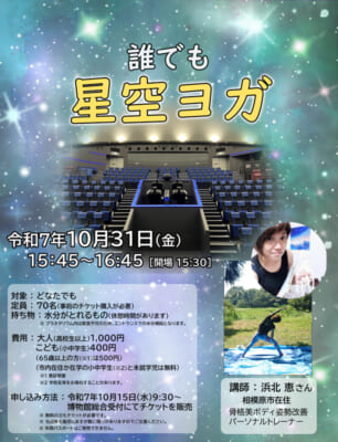 前半10分程は解説員による星空解説をお届けし、その後ウォーミングアップを行います。休憩を挟んで、プラネタリウムの座席に座りながら、インストラクター指導のもと、満天の星の中でヨガを一緒に体験します。インストラクターは相模原市在住の浜北 恵さんを迎えます。星を眺めながら、癒しの時間を過ごしませんか?