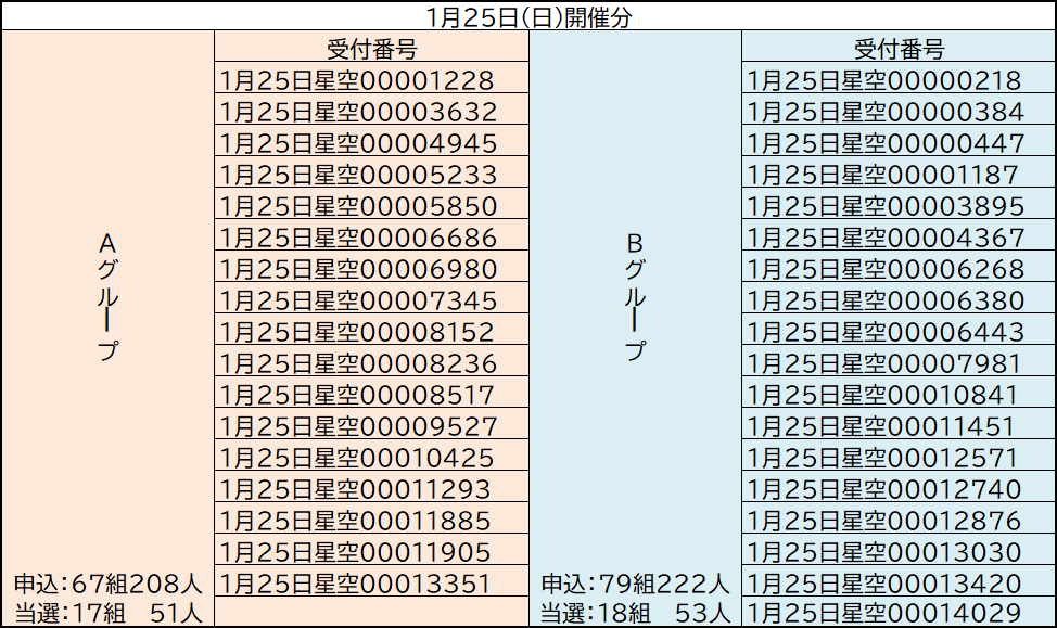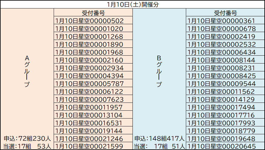 抽選の結果を電子メール及びこちらで発表します。当選した方の申込受付時に発行される受付番号を掲載しますので、忘れないようにご注意ください。