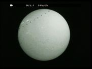 そのちょうど1週間前、まだ若田さんが滞在中のISSが、太陽の手前を通過するという珍しい現象が起こっていたのです。博物館には、太陽を安全に観測できる専用の太陽望遠鏡があるため、この現象をビデオ画像としてとらえることができました。博物館から太陽方向、直線距離で600kmほど離れたところをISSが通過していったのです。(写真参照。太陽面を瞬時に移動していくようす)仮に太陽面の中央を通過した場合でも0.8秒という短時間の現象でした。今回の現象はおよそ横浜線古淵駅から根岸線磯子駅を結ぶ線を中心に幅約7kmの範囲でしか見られませんでした。7kmというと徒歩2時間とかからない距離です。