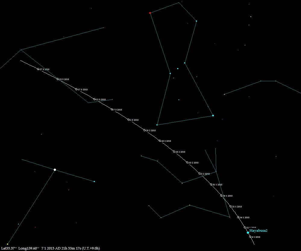 軌道要素がわかれば、星空を表示する、さまざまなプラネタリウム・ソフトで、「はやぶさ2」や「1999 JU3」の天球上の位置、どの星座のどのあたりにいるかを表示できるはずです。みなさんがお使いのプラネタリウム・ソフトで、新発見の彗星や小惑星の表示機能があるかどうか、確認してみてください。筆者がWindows95時代から愛用しているプラネタリウム・ソフトに、StarCalcというフリーソフトがあります。(http://www.m31.spb.ru/StarCalc/main.htm) StarCalcのメニューでは、Services の中に Asteroids and Comets という項目があり、Add というボタンで新たな天体の軌道要素が追加できるようになっています。同じく Services の中のPaths of Objects という機能を使ったものが次の図です。2015年1月1日から4月1日までの「はやぶさ2」の位置が5日毎に示されています。