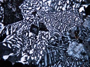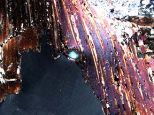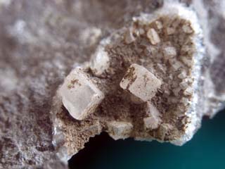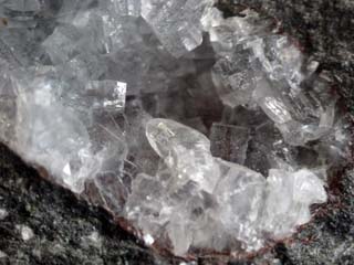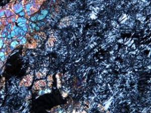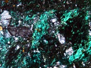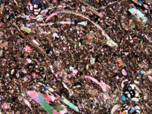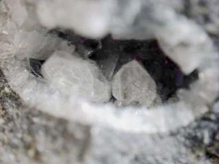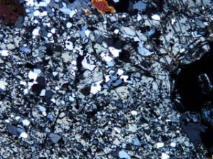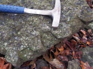 丹沢山地の凝灰岩のなかまの中には、沸石と呼ばれる鉱物が含まれていることがあります。沸石には菱沸石、輝沸石、方沸石、ソーダ沸石など多くの種類があります。多くのものは顕微鏡で見ないと判別できないくらい小さな結晶ですが、七沢付近ではごくまれに肉眼で見ることができる大きさのものが含まれていることがあります。肉眼で見えるといっても2~3mm程度の大きさです。丹沢山地の沸石は、岩石の隙間に鉱物の成分を溶かし込んだ熱水がしみ込んで、それが冷えて結晶ができたものです。
