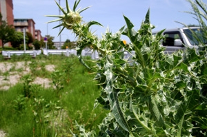 2010年5月、このアンテナがすごい外来植物の情報をキャッチしました。オオアザミというキク科の植物です。日本に渡来した歴史は古いのですが、神奈川県ではまだ野外の記録がありませんでした。それが横浜市の西のはずれ、相模原市からも近い場所に堂々と咲いているというのです。早速行ってみると、遠目にもわかる大きな株がありました。