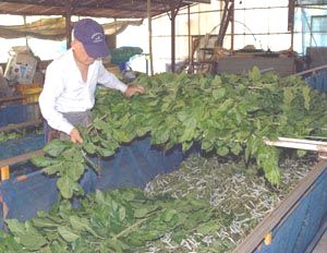 養蚕はたいへんな重労働です。3齢からさらに2回脱皮するまで2週間とちょっと。それまでは、脱皮前に2日ほど動きを止める「眠」の期間を除いて、ひたすら桑をあげ続けなくてはいけません。終齢の5齢になったカイコが桑を食べる勢いは、尋常ではありません。枝ごとあげた桑の葉が、みるみるうちに葉脈だけになってしまいます。