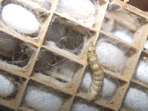 5齢になって8日ほどすると、カイコの体全体が飴色になります。これが、糸をはく直前の「熟蚕」です。このタイミングを見計らい、繭を作らせる「まぶし」に移すのですが、この作業の前にも大仕事があります。カビや寄生虫に弱いカイコを守るため、まぶしも部屋も消毒を行うのです。繭ができて中でさなぎに脱皮した頃、今度はまぶしから繭をはずしてケバを取り、ようやく出荷となります。