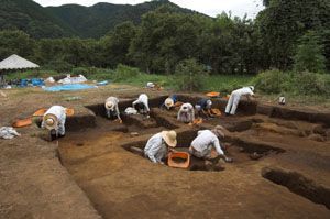 発掘現場見学会(平成22年8月8日開催) 多くの方々に支えられ、今年も大日野原遺跡の発掘調査を無事終了することができました。来年度以降も検出した竪穴住居跡の調査を継続し、縄文集落の実像に迫る研究を進めていきたいと思います。(考古担当:河本雅人)