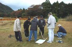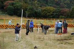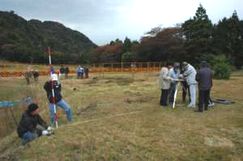 冷え込みが厳しく雨の降る日もありましたが、全員が真剣な眼差しで意欲的に学んでいる姿が非常に印象的でした。もちろんわずか3日間の研修で全ての知識や技術をマスターすることはできません。むしろ本番の調査の中で学ぶことのほうが大きいと思います。今回の調査は、等高線図を作成することだけが目的ではありません。地域の歴史を市民自らの手によって明らかにする学びの機会として位置づけようとしています。3日間の研修会はこの目標に向かって多くの人が手ごたえを感じることのできた有意義な時間であったと思います(考古担当:河本雅人)。