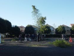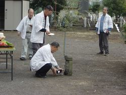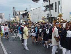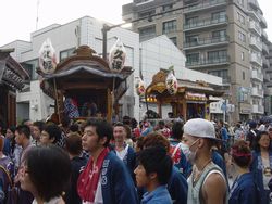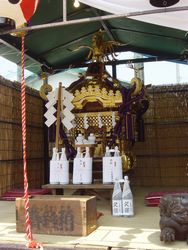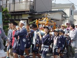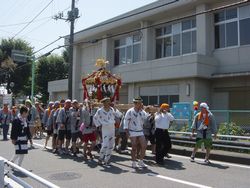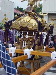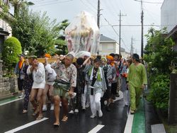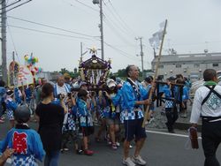 翌日の日曜日は、やはり子ども神輿が町内を回っている中、大人神輿が午前10時から1丁目から4丁目の順に担いでいきますが、例えば1丁目では1丁目の者が前面に出るというように、各町内ごとの担ぎ手が主に神輿を担くようになっているそうです。そして、当日は最後にものすごい雷雨に見舞われましたが、午後4時には出発した星が丘小学校に子ども神輿を含むすべての神輿と山車・太鼓が集まり、やはり神職による御魂抜きの式典が行われ、無事に今年の祭りは終了しました