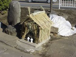 写真9は南区当麻の原当麻、写真10は同じく当麻の中・下宿で、いずれも藁などで小屋状のものを作る地区です。今年も10日には作られており、中・下宿ではそのまま置き、原当麻ではどんど焼きで燃やしてしまいます。