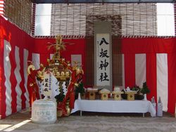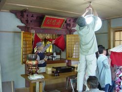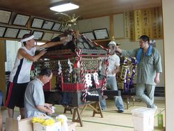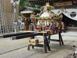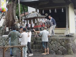 古清水は大島地区の中ではもっとも南側に位置し、田名に接した地区です。大島には諏訪明神と日々神社という大きな神社が二社ありますが、古清水は諏訪明神の氏子であるとともに地区内に八坂神社を祀っており、以前は7月20日、現在はその近くの土曜日に祭礼を行い、今年(2014年)は7月19日(土)に実施されました。実際の祭礼は、午前9時頃に自治会の皆様が自治会館(敷地内に八坂神社もある)に集合し、それぞれ準備が進められました。そして、自治会館内に大人・子ども神輿を運んで飾り付けが行われ、午後12時からの神官による神事の後、古清水では数十年ぶりとなる諏訪明神の獅子舞が奉納され、子どもたちを中心とした獅子舞が見られました。そして、午後1時30分頃から、昭和61年(1986)に製作された子ども神輿の巡行が始まりました。