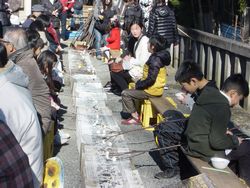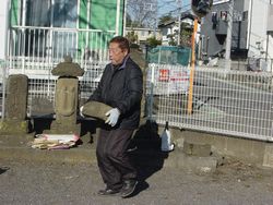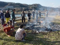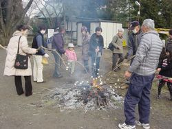 写真11・12は11日のもので、いずれも中央区田名地区です。この行事はかつては成人の日前日の14日に実施されることが多かったものの、ハッピーマンディー法が施行されて祝日が第二月曜日になってからは、地区によって日が異なる状況も見られました。しかし、最近は成人の日前日の第二日曜日が多くなっており、今年も各地で行われました。写真11は滝地区で相模川の河原で行われていました。写真12は陽原(みなばら)地区で、この道路向かいにある道祖神碑の近くにある家で行っています。陽原では三か所で実施するとのことで、すでに午後三時過ぎでもあり、団子を焼く人が帰った後ということもありますが、それでもそれほど多くの人々ではなく、今でも昔からの地域単位でこじんまりと行っている地区の一つです(民俗担当 加藤隆志)。