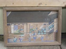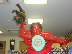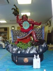 この金太郎人形は、台座を含めて二、四メートルの大きさで全身が赤く、小熊を右手で差し上げており、祭りの際に当麻田自治会館内に飾られます。普段、分解してしまってある箱に、明治27年(1894)に30円で八王子から購入したことが記されていて、屋台と一緒に買ったものではないかとのことです。ちなみに相原のもう一つの古い集落である森下の屋台も同じ時期に八王子から購入したようで、現在は無くなっているもののかつては人形(鐘馗[しょうき]?)もあったそうです。当麻田の金太郎人形は、以前取り上げた田名・清水集落と同様に一本柱に人形を付けて、その柱を前方から持ち上げて立てるものですが、当麻田ではほとんど人形を立てて屋台を巡行したことは無く、第二次世界大戦後には人形を乗せる台を作って曳いたことが二、三回ありました。ただ、15年ほど前に神社に持っていき、夜に照明を当てて飾った時はかなりきれいだったとのことです。なお、森下の屋台は、屋根の後部に手すり状の柵で囲った台があり、ここに人形を飾る形式です。