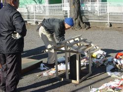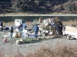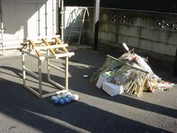 写真1は中央区田名の水郷田名(久所)地区です。田名は前日の11日(日)が多かったようですが、ここでは12日に相模川河原の高田橋の下側にたくさんの正月飾りなど多くの燃やすものを積んで大きなものが作られました。