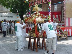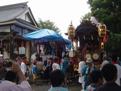 祭りでは、各町内の神輿(大人・子ども神輿)や山車が自らの町内を巡行する一方、本宮の日曜日には山車とともに、各町内での氏子回りを終えたすべての神輿が上溝商店街の通りに一堂に会し、勇壮に渡御することが祭りの呼び物となっています。今年(2014年)の祭りには、大人神輿13基、子ども神輿8基、山車8基が集まり、大変な盛り上がりを見せました。