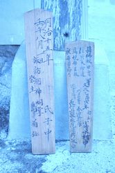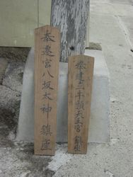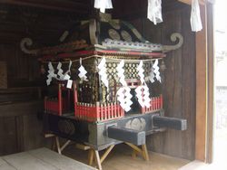 また、現在、大人神輿と子ども神輿が納められている八坂神社のお堂には、特に八坂神社の御霊のようなものは見当たらず、昔から神輿自体にお初穂を供えるなど、神輿そのものがご神体と考えられていたようです。やはり『相模原市史民俗編』では、上溝や田名でお天王様といえば神社を指すのではなく、祭りそのものやあるいは祭礼で担ぐ神輿のことを指し、神社がなくても祭りは行われ、この場合は神輿がお天王様となるとされており、古清水の場合もこの事例に当たります。さらに、大人神輿には文政九年(1826)六月の銘がある棟札が納められており、神輿自体を天王様(棟札には八坂神社の旧名である「奉建立 牛頭天王(ごずてんのう)宮 鎮座」と記されている)としていたことや、神輿に御霊を入れる祭祀を行った者が、津久井・長竹村の修験者の泉乗院であったことなどが記されています。神輿には明治十五年(1882)八月の棟札も入っており、このような神輿に関する資料が残されていることは大変貴重であり、今後、他の地域での調査が期待されるところです。