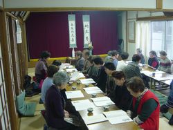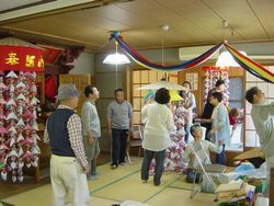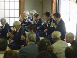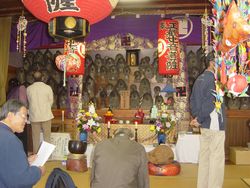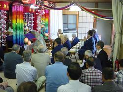 初日の11日の観音様の開扉式は午後0時から行われました。まず実行委員長をはじめ何人かの方からご挨拶があり、昨年の12月から33名の委員のもとで諸準備を進めてきたことや、オヒイチ作成や御詠歌の額の修理の経過など、さまざまな御開帳に係わる点について報告されました。そして、地元の功雲寺(津久井城主であったと伝える内藤氏の墓があることで有名です)の住職・副住職による読経の中、参列者一同に焼香が回され、8名の女性たちによる御詠歌がありました。その後、住職の挨拶、記念撮影と進んで懇親会となりました。また、最終日の31日には閉扉式があり、午後2時から11日と同様に住職による読経や女性の御詠歌も行われました。