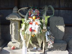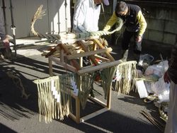 当日は、上組では午前9時から個人宅の車庫で作り始め、約一時間ほどで完成して道祖神碑にお社を被せました。下組では、田名新宿の神社である稲荷社に納められていたお飾りを自治会館(観音堂も兼ねています)の敷地に運んで選別したりして、10時頃から製作が始まりました。まず敷地内にある道祖神碑をお社を作る場所に移し、屋根を杉葉で葺いて棟などの部分は大根巻きと呼ぶ太いしめ縄で囲い、回りもお飾りで飾っていきます。下組の方もやはり一時間弱でできました。この後は、午後1時からの点火までしばらく置いておきます。そして、点火前には上組のお社を自治会館に運んで上下のお社を並べ、下組のお社から道祖神碑を取り出して元の場所に戻して点火となります。その後は適宜、団子を焼きに来る人が訪れ、いろいろと話をしながら団子を焼いてその場で食べたり、家に持ち帰る姿が見られました。なお、やはり15年ほど前まではお社を上組と下組が別々に作るだけでなく、燃やすのもそれぞれの場所で行っていたとのことです。