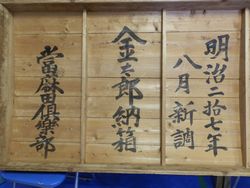 こうした伝承がある久保や番田諏訪面ですが、現在は両地区とも大人神輿と山車を有しています(番田諏訪面は子ども神輿もあり)。久保では、昭和22年(1947)終戦後いち早く青年層の発意で、天王祭を町内に復活しようと呼びかけて町内全般の賛意を得て神輿を造りました(『上溝の夏祭り』 上溝夏祭り実行(常任)委員会 1989。番田諏訪面の神輿は昭和55年製作)。この神輿は浅草の宮本卯之助商店から購入したもので、購入に際して寄付をいただいた方の名前を記した板が現在も見られます。また、東京が大きな空襲に遭った中でこの神輿は戦災を免れた三基のうちの一基で、真ん中の大きさの神輿が久保、もう一基が丸崎に来ており(一番大きなものはどこに行ったか不明)、久保と丸崎の神輿は兄弟分と言われているそうです。戦後まもなくの昭和22年当時であり、購入には金とともに米や麦など食糧を持っていかないと売ってくれなかった、との話も伝えられています。なお、山車も神輿と一緒に造られ、山車で奏でる囃子は丸崎に習いに行きました。この山車は、その後、南区当麻の原当麻集落に移され、現在の久保の山車は昭和52年(1977)に新たに造られました。この際の寄付者を記した板も残っています。