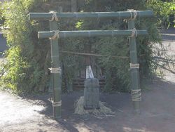 田名新宿集落は田名地区の中でも東寄りに位置し、上溝地区に近いところです。田名新宿では、今年は1月11日(日)にどんど焼きが行われました。この地区の古くからの家々は集落の中を通る旧道に沿ってあり、北側の上組と南側の下組に分かれています。そして、上組・下組ともにお社(オヤシロ)と呼ばれる、道祖神碑に被せるものを作っています。今から15~16年ほど前までは、各家から納められる正月飾りでお社を作っていましたが、現在では正月飾りが少なくなったため、設計図に基づいて枠組みを木材で作り、回りを正月飾りで飾るようになりました。これに対して、上組の道祖神碑は交差点の角に他の地蔵などの石仏とともにあり、動かすことができないのでお社を道祖神の横から入れ、下組の道祖神碑は移動ができるため、上から被せるように作るそうです。