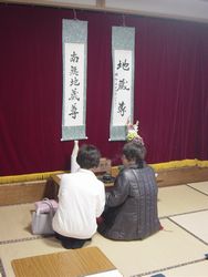 いずれにしても、こうした行事が行われることは市内でもかなり少なくなっており、以前は各集落で行われていた念仏講もめっきり少なくなっています。実は古山集落の下古山で各家を順番に回して実施されていた念仏講は平成14年(2002)3月の彼岸念仏で終了し、念仏講で使われていた掛軸などは博物館に御寄贈いただいています。今回紹介したこの念仏も二〇名ほどの方がお集まりになりましたが、それでも参加される方が次第に少なくなっているとのことです。地元で大切に祀られてきた地蔵様の念仏が長く継続されることをお祈りするとともに、これからも各地のこのような行事について「民俗の窓」で取り上げることができたらと思います(民俗担当 加藤隆志)。