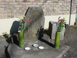 古山地区は下溝のもっとも北側にある集落で、「民俗の窓」No.37では平成24年7月の天王祭について触れています。古山集落の南側にある古山坂(下坂)の登り口の所にある小さな祠の中に祀られているのが地蔵塔で、現在では大正頃のものが前側にあり、それ以前の古い地蔵と思われるものが裏側に置かれています。この地蔵は子育地蔵と言われ、4月と12月の4日が地蔵様の日で、かつては近所の人が自家製の煮物や菓子などを持って集まり、祠の前にムシロを敷いて念仏をしていました。その後は地区の公会堂に場所を移し、現在でもこの両日に古山の高齢者の女性によって念仏が行われています。