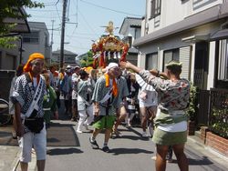 星が丘地区には神社はありませんが、毎年7月には星が丘1~4丁目全体の祭りが行われています。この祭りには神輿や山車も出て、大人神輿の担ぎ手は各町内から20名ずつを目安に募っており、子ども神輿や山車は各自治会で持っています。また、祭りの実行委員長(1名)・副委員長(3名)は各自治会長が務め、別に組織されている夏祭り保存会も、各町会から男性2名・女性1名が出て祭り全般のことを担当し、次年度以降に祭りのやり方を引き継ぐ仕組みとなっています。地区の有志が会員となっている星友睦という神輿保存会もあり、各自治会から募集された方々と一緒に神輿を担ぐとともに、神輿の飾り付けや出し入れなど、神輿に関するさまざまな仕事に当たります。