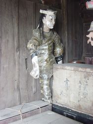 古清水にはかつては山車があり、この山車は明治二十八年(1895)に、宮大工の地として著名な愛川町半原の矢内右兵衛が建造したもので、残念ながら古い時期に壊れてしまったようで現在は残っていません。ただ、山車に飾った日本武尊(ヤマトタケルノミコト)の山車人形がかなり傷みは多いものの残されています。山車人形は、「相模原の民俗を訪ねて(56)」でも紹介したように、古清水と接する田名・清水地区にもあり、相原・当麻田でも残されていることが分かってきました。こうした山車やその上に飾った人形等についても引き続き調査が必要です。