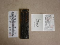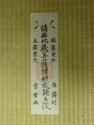 ところでこの地域の民俗について大変に詳しく、博物館の建設に際しても本当にお世話になった座間惣吉さん(博物館の常設展示室内にある物置は、座間惣吉さんの家にあったものです)が書かれた『古山こぼれ話』(1978年3月刊)によると、この地蔵は子育て地蔵として子どもができない者が信仰すると子どもが授かり、よく育つと言われる一方で、「雨降り地蔵」で夏場に干ばつが続くと雨乞いに地蔵を下側を流れる道保川に入れ、水をかけて降雨を願いました。その後、雨が降ると「おしめり正月」で地蔵を元の位置に納めお神酒と菓子を供えてお礼をして、大人は仕事を休み、子どもには菓子のおすそ分けをしたとのことで、このような雨乞いは第二次世界大戦後にも何回か行われたようです。現在では、この地蔵が雨乞いにもご利益があったとの話はほとんどなくなっているようですが、当日の参加者に配られる御札には「請雨地蔵菩薩」と記されており、まさに雨降り地蔵であった頃のなごりを留めています。周辺では雨乞いに地蔵を水に投じた例として、同じ下溝地区の大正坂下にある日之下地蔵があり、地蔵に限らず石が用いられたものとして田名地区のジンジ石・バンバ石なども有名です。こうした点からは、地域の中で地蔵やそのほかの石などが、その時期の人々のさまざまな願いに応えながら祀られていたことがわかります。