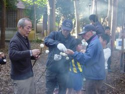 写真4~8は南区古淵で、昨年から14日夕方に固定されていたものが、第二土曜か日曜というように日取りが大きく変わった地区です。今年は10日の午前9時30分から準備が始まり、正月飾りで飾る道祖神の小屋と、木材と枯れ枝などを積み上げたものの二つが作られます。昔は古淵では上と下の二か所でどんど焼きが行われていたことや、この火を家に持って帰って神棚のろうそくに点したり、書初めも燃やしたことを伺いました。また、各自が焼いた団子を取り替えるトッケエ団子は今も行われており、三つ又の枝の先に取り付けた三個の団子のうち二個を取り替え、一個は自家用に持ち帰るとのことです。