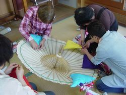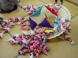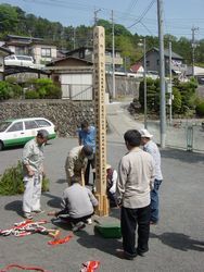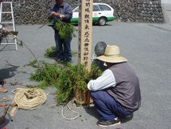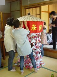 観音堂前に回向柱を立てる 回向柱の下には杉の葉を飾る 鰐口を叩くための綱を男たちが集まって編むできた綱を堂の前に取り付ける 用意されたオヒイチ オヒイチを傘に取り付けていく 作業は野外と室内とで手分けして行われ、野外では、回向柱を立てたり柱の下に杉葉を飾る、参拝者が鰐口(わにぐち)を叩くための綱を編むなどの作業が男性によって行われます。室内では女性の手により、傘を上側に付けてそれぞれ繋げたオヒイチを観音様の両側に飾りつけ、これとは別に個人の方から奉納された千羽鶴なども飾ります。そして、男性の仕事になりますが、提灯を取り付け、観音像の手に結びつけるお手綱とそれをつなぐ五色の布などの用意も行われました。なお、五色の布を通じて観音様のお手綱が結び付けられる回向柱は、オヒイチと同様に12年に一度の本開帳の時に新しくして、その間の中開帳の際には表面を削って使うそうです。