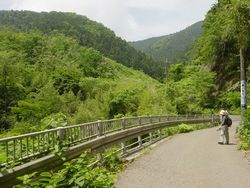 今年の春のフィールドワークは、八王子市浅川地区の甲州道中旧道と八王子城跡の見学を企画しました(加藤を含めて12名参加)。まず午前中は、昨年の秋に中央線の上野原駅から藤野駅方面に向って甲州道中の旧道沿いに残る上野原宿本陣や番所跡などを訪れたのにつなげる意味もあり、今回は途中にそびえる甲州道中の小仏峠越えはまたの機会として、小仏峠を越した麓から高尾駅までのコースとしました。途中では、台座に大きく「小仏宿」(甲州道中の宿場)と書かれた馬頭観音塔(弘化四年[1847]再建)や駒木野宿にある小仏関所など、甲州道中の名残りを示すものや、高尾山信仰とも係わる蛇滝茶屋跡、中央本線開設時からの煉瓦構造物など、いろいろなものを見ながら少し早足となりましたが歩きました。