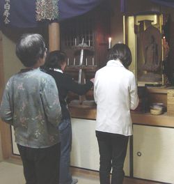 オコモリが始まる前に、参加者は観音様に線香をあげて拝んでから席に着きます。そして、部長の挨拶等があり、以前録音したテープを流しながら前述の和讃(念仏)が開始されました。途中、お拝み念仏が終了した後には、参拝者(婦人部の役員以外の参加者)にお茶と少しの砂糖が出され、砂糖を少し舐めてお茶を飲み、のどを潤してから引き続いてお茶念仏となりました。また、オコモリが始まる前には、観音様の両脇の太いろうそくとは別に小さいろうそくも何本か火を灯しますが、このろうそくは燃え尽きる前のかなり短くなった時に新しいものに取り替え、先に燃やして短くなったろうそくは捨てずに置いておきます。オコモリで灯した短いろうそくを持ち帰り、お産を控えている家では丁重に灯して安産を祈ったり、出産が始まった際に灯すと安産だとか、ろうそくが燃え尽きるまでに早く生まれて陣痛も軽く済むと言われているそうです。和讃(念仏)は約25分ほどで終了し、その後は全員配られた菓子や茶を飲んで歓談となりました。