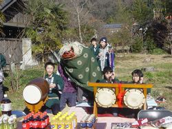 三井 集落の新年のつどいとしてどんど焼きが行われ、多くの人が集まる中、お囃子も奏でられた。