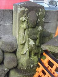 当日は、まず本厚木駅周辺の見学ということで、相模川の厚木の渡し場跡のほか、道祖神碑や地神塔などが祀られている稲荷社などに行きました。地神塔は、ほとんどが「地神塔」や「堅牢地神」などの文字を記したものであるのに対して、この地神塔は地神講の際に飾る掛軸に描かれた武神像が彫られており、珍しいものです。また、俵の形をした小さな俵石もこのあたりではあまり見かけないものといえます。