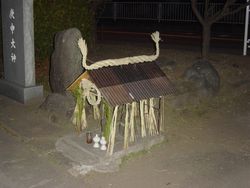 南区当麻中・下宿 毎年、道祖神の上にお飾りで小屋状のものを作る地区だが、今年はトタンの屋根ができていた。