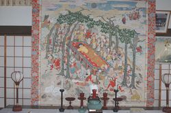 特に一袋の中にどの動物をいくつ入れるという決まりはなく、ただ蛇は喜ばれるので蛇だけは必ず入れるようにします。各家に配られた団子は家々によってさまざまで、ある家では一年中仏壇に置いておき、新しいものが来たら昨年の分を下ろして朝の味噌汁に入れて食べ、別の家では蛇だけを仏壇に置いてそのままにしておき、他の団子はすぐに食べてしまうと言います。そして午後2時から始まった涅槃会は住職と副住職の読経や御詠歌があり、15分ほどで終了しました。この後、涅槃図の前に置かれていた団子は各家に配られることになります。