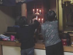 観音堂がいつから祀られているのかはっきりしないようですが、現在、91歳の女性の方が結婚した70年ほど前にはすでにこうした形で行われており、観音様の厨子を開けてお姿のご開帳をし、ろうそくを灯して念仏を唱えて観音様を迎えるオコモリが行われていて、安産のご利益があるとされていたとのことです。今回のオコモリでも、子どもが無事に生まれた家がお礼のお参りに来られたり、ろうそくを近所の人から貰ってくるように頼まれたという話を伺うことができました。