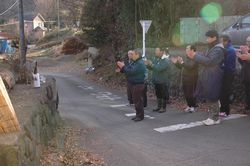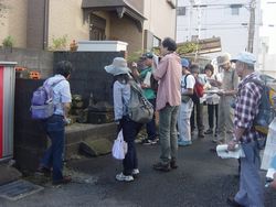 熱心に地神塔などを見学する参加者。住宅地の中に思いもかけないものがある