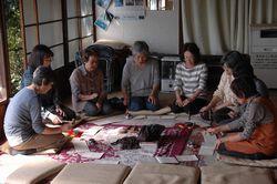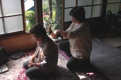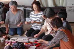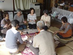 このように数珠念仏は約20分弱で終了して、当番の方を中心に昼食の準備となりますが、使い終わったばかりの数珠で参加者の背中や腰を叩くことも見られました。例えば肩こりがある人が数珠で肩を叩くとコリが取れるなど、体の痛いところに当てて叩くと良くなるとされているとのことで、参加者はそれぞれ気になる場所を叩きました。ちなみに今回は津久井町史編さんのための調査として町史の職員とともに訪れ、私たちも叩いていただきました。そして、この後は昼食となり、かつては参加者は前後に体をゆすりながらかなりゆっくりと念仏を唱えたため時間が長かったことや、中学生くらいまでの子どもに終了後に菓子を配り、この菓子は地元から出ている人が数珠念仏に合わせて送ってくれたもので、子どもは菓子をもらうのが楽しみだったことなど、地域のいろいろなお話しを伺うことができました。