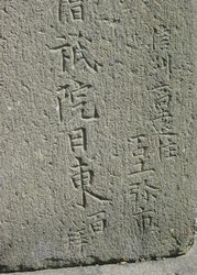 寛政11年(1799)の題目塔。周辺六か村の講中によって造立された。講中では助け合って先祖の霊を弔い、信仰を深めたとされる。