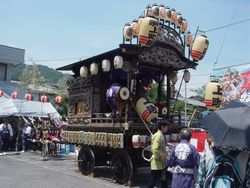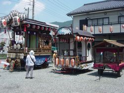 川坂の山車。中央はかつて使用されていた山車。手前は太鼓車