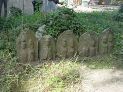 次にバスに乗り、愛名地区の妙昌寺にある二基の題目塔に向かいました。これは信州高遠石工が七沢石を用いて作った厚木市内最古のものとされ、七沢石の石場の切り出しと高遠石工の係わりを示すものとして知られています。残念ながら宝永7年(1710)のものは石工名の部分の剥離が進んでいますが、明和2年(1765)の題目塔は石工弥市の銘もはっきり読むことができます。続いて式内社と伝える小野神社において、地区内にあったものを集めた5基の道祖神を見学しました。文化3年(1806)の双体像のほか、3基の双体像と県内では相模川中流域に分布する1基の単体像も眼にすることができます。