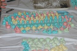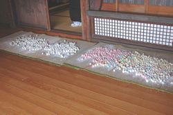 団子作りは涅槃会前日の13日の午前中に行われました。蒸篭(せいろう)で蒸した米粉を、白いままのほかに青(水色)や赤(ピンク)・緑(若草)・黄色など、いろいろな色に染めてよくこねます。作る動物は涅槃図に描かれているものなら良いとのことで、蛇やタヌキ・犬・鳩・ウサギなどが中心です。また、動物によって特に色などが決まっているわけではなく、動物の形のほかに丸い団子も同時に作ります。材料となる米は団子をいただく檀家から供えられたもので、今年は一斗三升の米粉とのことでした。ずいぶん多いように思えるものの、昔に比べるとずいぶん量は減っているそうです。実際に団子を作るのは檀家の婦人部の女性たちで、いろんな話をしながら和やかな雰囲気の中で昼時までには完成し、団子は翌日までそのまま置いて乾燥させます。