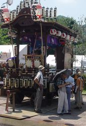 当日は、まず午前中に各自治会の本部に置かれている山車を順番に見学していきました。そのなかには、「民俗の窓」No.38でも紹介した、大正13年(1924)に八王子の八日町一・二丁目から上町が譲り受けた山車もあり、雄略天皇を乗せた人形山車の形態で、明治10年代に作られた八王子でも古い形態のものとされています。そして、昼食後には六基の山車が一同に集まって神事が行われる、旧道とバイバスの合流点付近の大沢本部前に赴き、神事の様子や六基の山車がそれぞれ賑やかに囃子を行う叩き合いを見学しました。この後、山車は順番に中野地区の旧道の町並みを囃子を奏でながらゆっくり進み、各自治会の本部を夕方にかけて順番に回っていきます。こうした山車の運行は夜にも行われ、真夏の夜に華やかな囃子の競演が行われることになります。