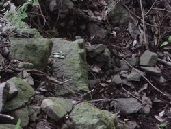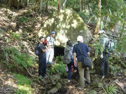 午後からはいよいよ七沢石の細工場跡で、広沢寺温泉入口バス停から30~40分ほどの平坦な道や登り坂を歩いてようやく到着しました。道沿いの少し沢を上った当たりに、ノミやクサビを入れた跡などが残った石をいくつか確認することができ、その場で地質の観点からの説明を聞いてまた来た道を引き返してバスで本厚木駅に向いました。