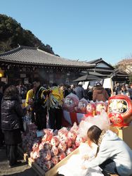 小田急線柿生駅から歩いて20分ほどの所にある麻生不動(川崎市麻生区下麻生)は、昔から火防せの不動として有名で、古くから火難から守ってくれる不動様として信仰されてきました。毎年1月28日の初不動の日が縁日で、この時ばかりは普段はひっそりとしている境内が大勢のお参りの人々で大変な賑わいを見せます。お堂に到る参道には多くの露店が並び、食べ物を売る店や金物類・日用品などさまざまなものがある中で目に付くのがだるまを売る店で、この縁日が「だるま市」と言われるゆえんになっています。だるまが売られるようになったのは明治の終わりころで、平塚近辺で作られている相州だるまが中心です。