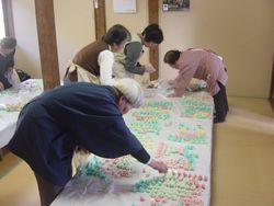 翌14日は、まず12時に寺に御詠歌を上げる女性の方々が集まり、各檀家に配るために袋に動物と丸い団子を入れていきます。今年は涅槃図にお供えするものなどを除いて全部で87袋分を用意することになっており、数は全体の量を調整しながら詰めていきました。