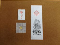 不動が描かれた御札と現在授かることができる穴あき銭。穴あき銭はもちろん模したもの。