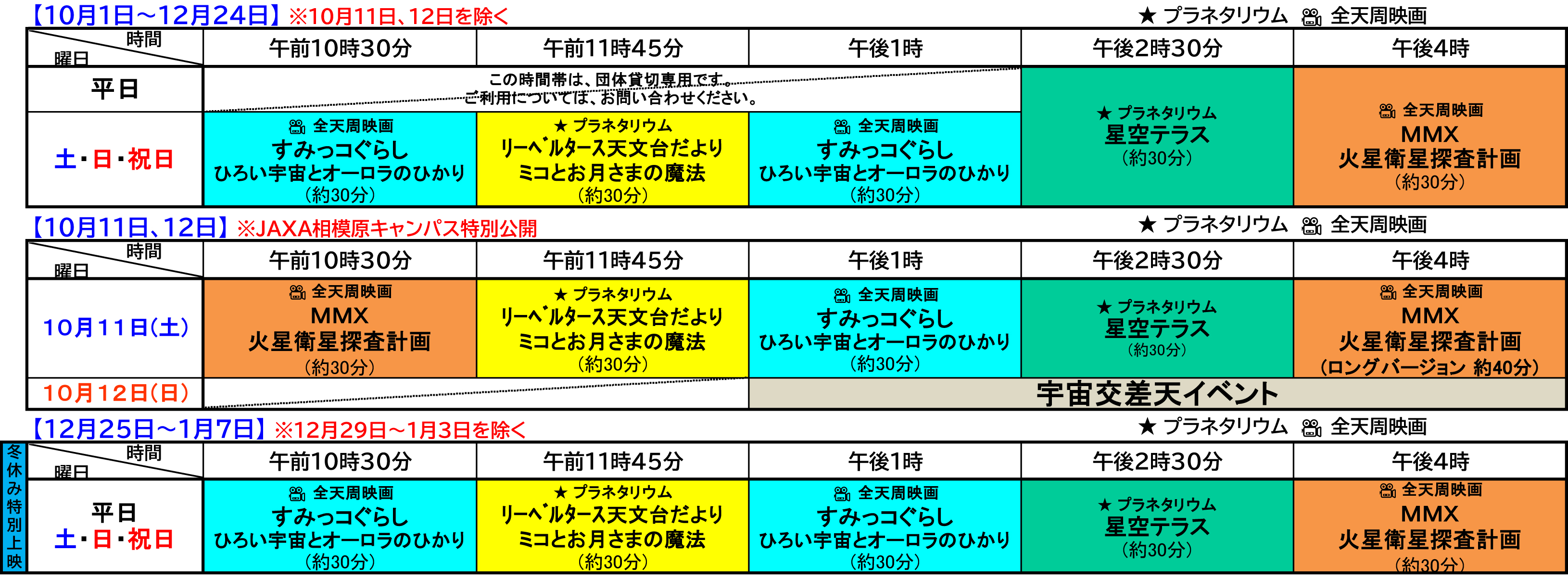 投影・上映スケジュール ★令和7年10月1日(水)~ 令和8年1月7日(水) プラネタリウム番組の内容についてはこちら ※内容が掲載されていない番組については順次更新を行いますので、しばらくお待ちください。 ※スケジュールはイベント等により変更となる場合があります。 ※10月31日(金)午後4時の回「MMX 火星衛星探査計画」はイベント開催のため、上映がありません。 【休館日】 10月6日(月)、14日(火)、20日(月)、27日(月) 11月4日(火)、10日(月)、17日(月)、25日(火) 12月1日(月)、8日(月)、15日(月)、22日(月)、29日(月)~31日(水) 1月1日(木)~3日(土)、5日(月)、13日(火)、19日(月)、26日(月)